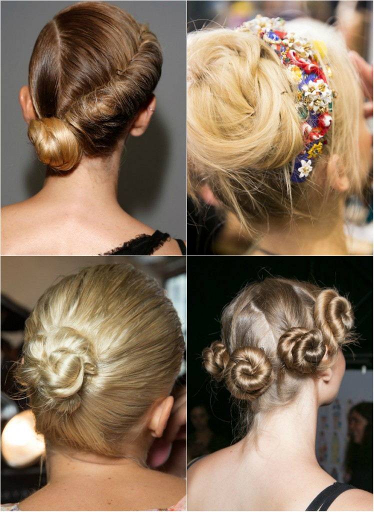 Небрежный стиль в укладке, который преобладает в этом году, распространяется и на прически с пучками, только не забудьте слегка начесать волосы у корней.