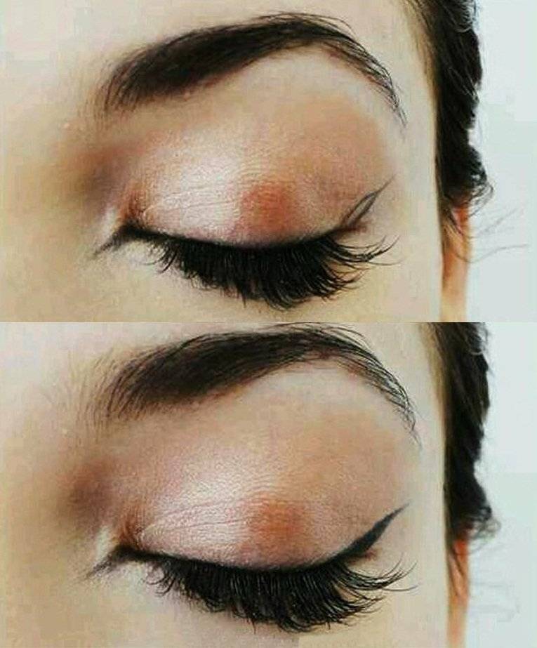Лучше выбирать водостойкую жидкую подводку, так нависшее веко не сможет стереть стрелку в течение дня. Если глаза большие, нужно помимо стрелки обязательно нанести тени. Так взгляд будет более гармоничным.
