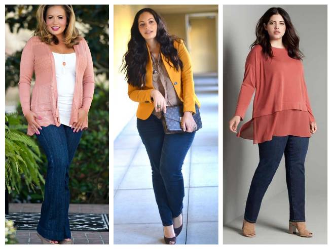 В гардеробе любой девушки обязательно должны присутствовать джинсы. Брюки из денима с низкой посадкой категорически не подходят для дам в теле, демонстрируя лишние сантиметры. От высокой талии также следует отказаться, отдав предпочтение золотой середине — средней посадке. Избегайте накладных карманов и декоративных элементов в области бёдер, которые придают дополнительный объем.