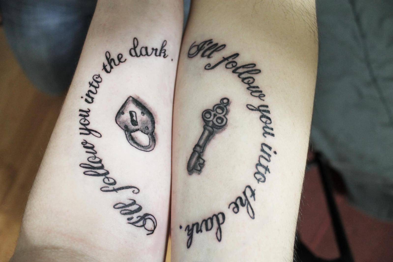 , делящиеся на категории по назначению. Наиболее обширен класс наколок для влюбленных. Парные тату они выбирают символические, к примеру, ключ на правой руке одного человека и сердце с замочной скважиной на левой другого. Композиция говорит, что партнер открыл душу второго, ее потайные уголки.