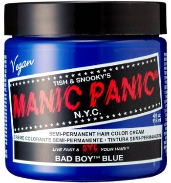 - Manic Panic – это крем-краска, которая существует на рынке более 30 лет. В её составе нет аммиака, цвета насыщенные, а запах приятный. Синяя палитра имеет 5 различных оттенков, подходящих для окрашивания тёмных волос. В упаковке есть защитные перчатки и кисточка для нанесения средства на волосы. Цвет остаётся насыщенным около 2 недель, а затем начинает смываться. Цена упаковки от 1000 руб.