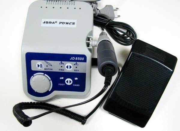 Это совершенно другой уровень устройств, которые в комплекте кроме педали и насадок имеют удобную рукоятку. Аппараты идут в прочных корпусах, оснащенными регуляторами, позволяющими менять скорость фрезы. Также профессиональные приборы обладают увеличенной мощностью.