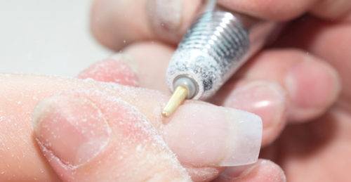 - затем следует обработать ногтевую пластинку и птеригий карундовой фрезой;