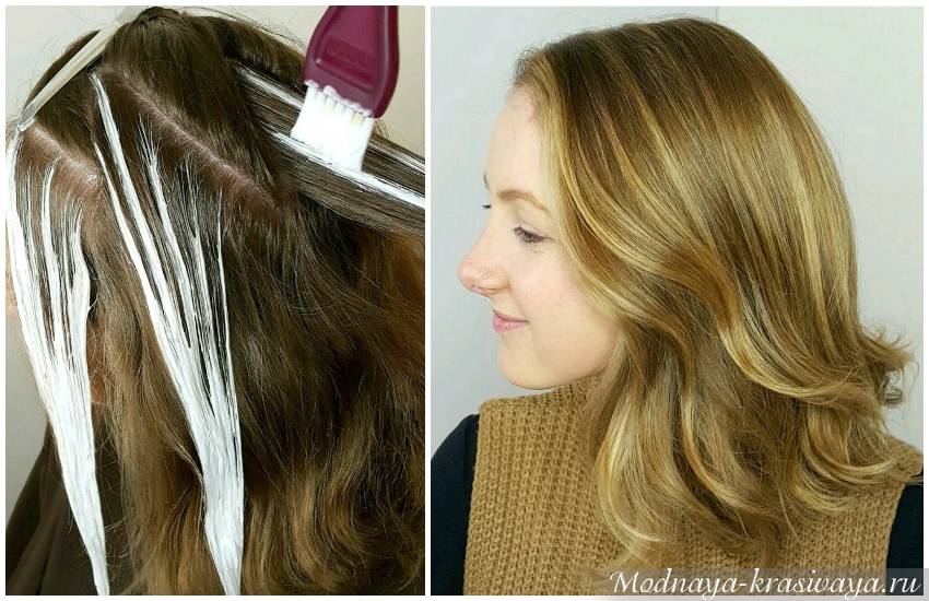 На светлые волосы лучше выбрать светлую и более темную краску. Разница между ними составляет полтона. Благодаря такому сочетанию получится создать эффект природного выгорания. Светлая краска служит для окрашивания внешней стороны, а темная – для внутренней. Ширина окрашиваемых прядей может быть 1-2 см.