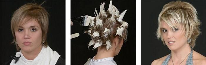 Чтобы покрасить короткие волосы, нам понадобиться всего лишь губка. Необходимо сделать прикорневой начес и зафиксировать его лаком. Легкими метущими движениями губки наносим краску на кончики локонов. Время пребывания красящего состава на волосах зависит от требуемого оттенка.