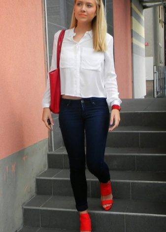 Если ваши босоножки лаковые, попробуйте скомбинировать их с одеждой из джинсовой ткани. Это могут быть не только джинсы, но и юбки, бриджи, куртки. Лаковый красный сделает джинсовую одежду более изысканной. К такому наряду отлично подойдёт белый верх, дополненный крупным аксессуарами.