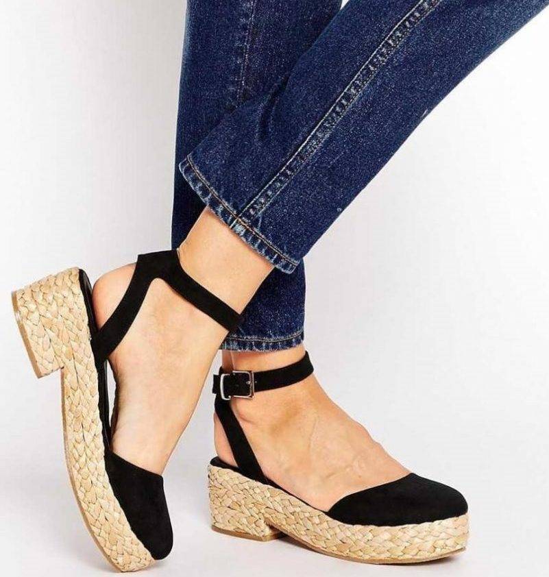 - на танкетке, которая позволяет наслаждаться преимуществом каблуков и комфортом плоской подошвы.