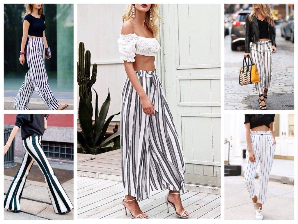 Такой вариант подойдет для фона любой палитре оттенков. Востребованными остаются черные брюки в белую полоску. Кроме этого черные линии могут комбинироваться с серыми, красными и любыми другими.