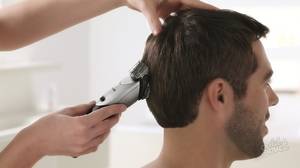 - Установите насадку с большой длиной и состригите все волосы от начала роста до линии височной области.