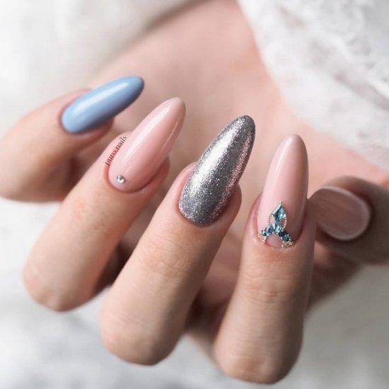 Прекрасным доказательством того, что много блеска не бывает, особенно на ногтях, это посмотреть на фото дизайна маникюра 2019-2020, сочетающего в себе несколько видов сверкающего нейл-декора.