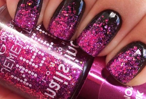 Темный. Не менее интересно сочетаются блестки и с темными покрытиями чёрного, бордового, серого, ягодного или сиреневого цвета.