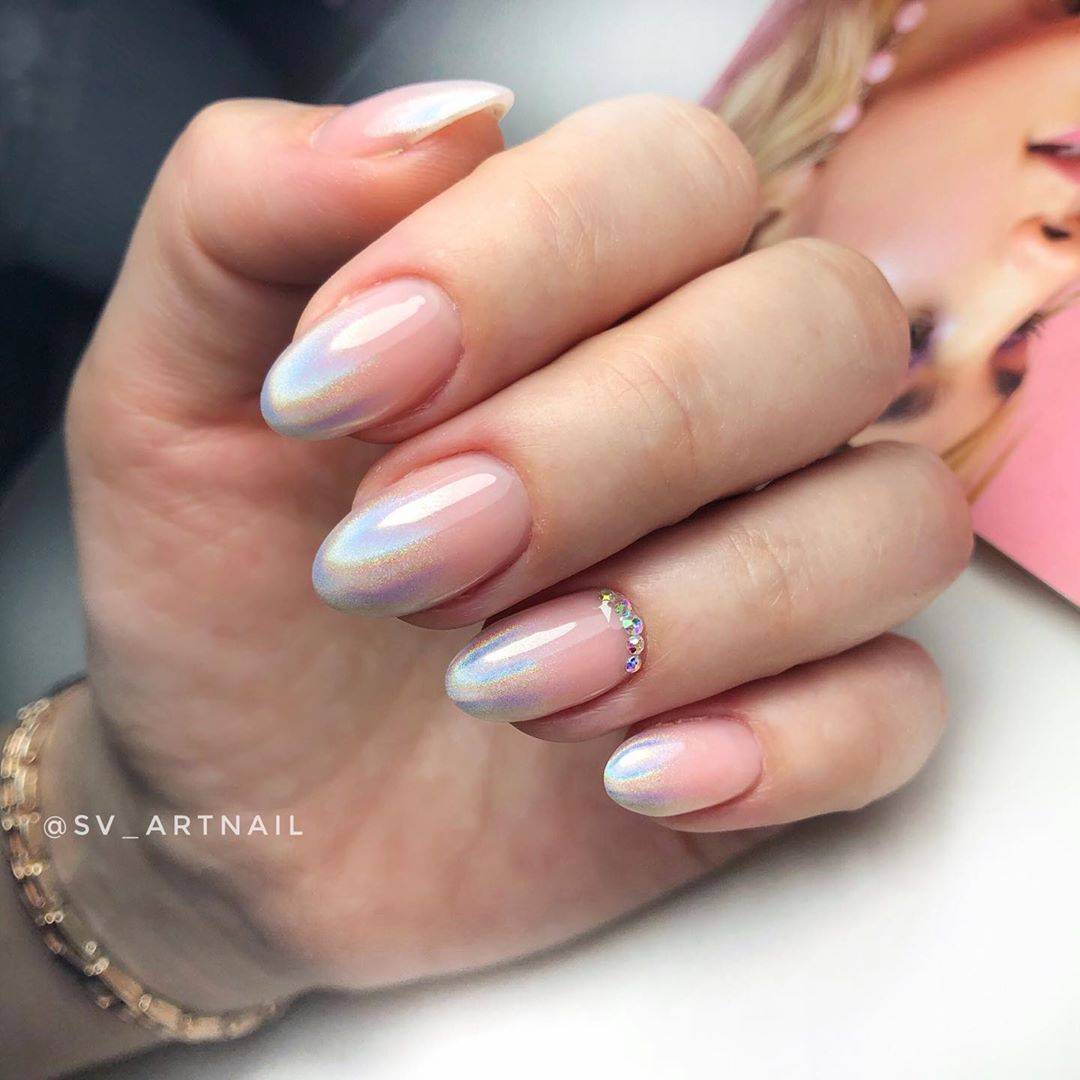- радужная – также имеет название русалка, единорог, аврора. На ногтях втирка смотрится с теплым мягким свечением. Внешне напоминает жемчужный эффект, но с дополнительными яркими тонами.