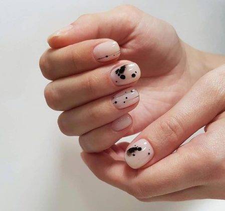 Так как в 2019 году черный цвет часто стал появляться в повседневном маникюре, то у стилистов появилось удачное решение – оформлять полностью темным цветом только ногти большого и указательного пальца. Остальные дополняются лишь черными деталями. Например, тончайшим узором или геометрическим изображением птиц, животных.