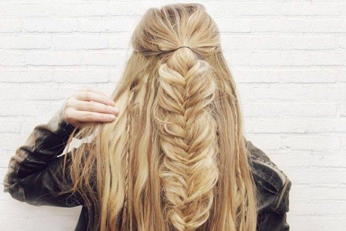 - Разделите хвост на 2 части и плетите из каждой косичку в технике «рыбий хвост». Не менее эффектной эта прическа получится в том случае, если косы выполнены в разных техниках.