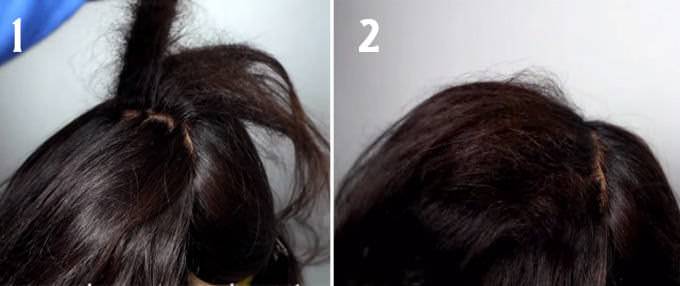 - Волосы на макушке головы начесываются у корня и фиксируются лаком. Это придаст прическе необходимый объем, который увеличивается в 2 раза.