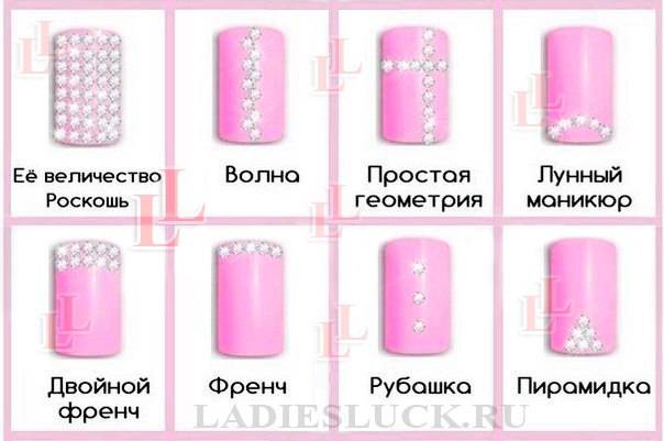 Схема создания маникюра со стразами своими руками выглядит следующим образом: