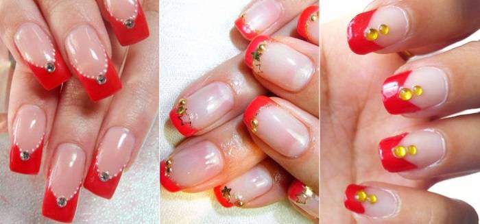 Для маникюра в красных тонах подойдут стразы серебристые, чёрные или красные, близкие по оттенку к самому тону лака. С тёплыми томатными оттенками ярко смотрятся белые, синие (морской стиль) и чёрные стразы. Актуален френч на алом лаке с чёрным кружевом, красными, золотистыми и чёрными стразами.