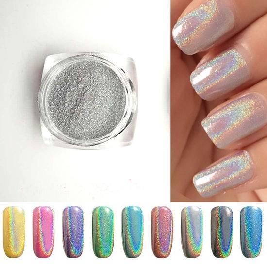 - Голографические блестки наряду с сухим глиттером. Такой материал предназначен только для гель-лаков. Если вы используете мелкий глиттер, ногти получат перламутровый блеск;