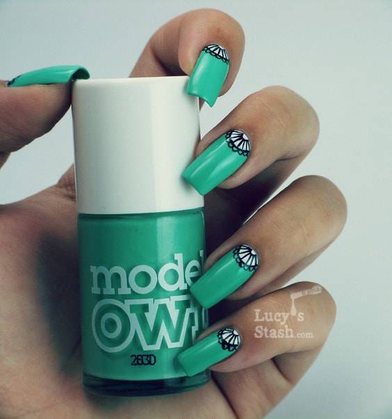 Как и во французском маникюре, в лунном белый полумесяц можно заменить кружевом, которое рисуется кистью, наносится с помощью стемпинг-трафаретов или вообще наклеивается. Главное чтобы у кружева сохранялась дугообразная форма.