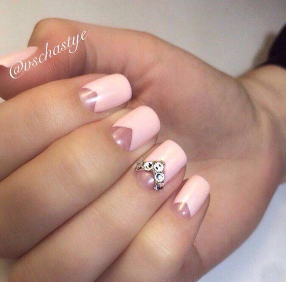 Розовый, впрочем так же как и бежевый, является универсальным цветом для повседневного маникюра. Он незаменим для оформления коротких ногтей, т.к. светлые оттенки зрительно удлиняют ногти. Розовый — цвет весны и лета. От сочетается с цветочными орнаментами и вензелями. При желании можно сделать и геометрический рисунок, например выложить его фольгой «битое стекло», она очень стильно смотрится на розовом гель-лаке.