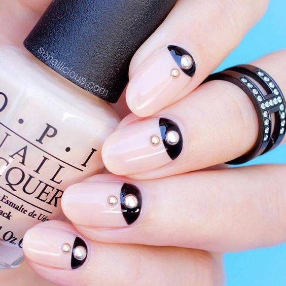 Маникюр, в котором полукруг у основания ногтя остается без покрытия. Границу, где начинается лак можно декорировать бульонками, стразами, мелким жемчугом или металлическими заклепками. На создание такого симпатичного дизайна ногтей уходит совсем немного времени, а если еще использовать стойкий гель-лак, который моментально отверждается под воздействием УФ-лучей, то такой маникюр просто палочка-выручалочка для очень занятых девушек. Тратить много времени на маникюр гель-лаком не придется, а ручки будут выглядеть очень ухоженно и модно.