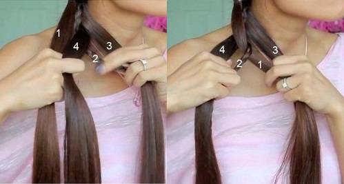 - Сделать жгут, при этом прядь разделить на 2 равные части, положить волосы крест-накрест, правую часть прокрутить 3 раза вокруг своей оси и положить поверх левой. Переплести после этого обе пряди. Повторяя данные действия доплести жгут до конца.