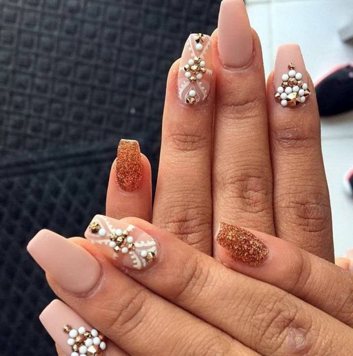 Эти ногти напоминают о Снежной Королеве. Длинные, узкие, оформленные нейтральными оттенками розового, которые всегда популярны, с большим количеством стразов – они являют собой настоящее украшение.