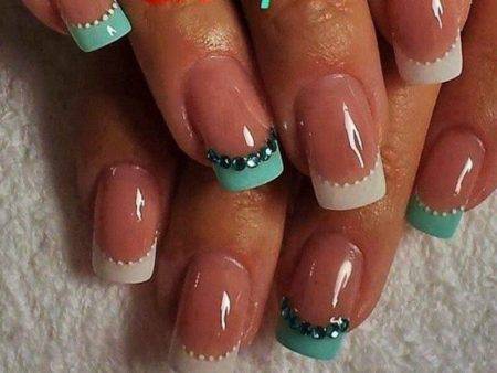 Среди них популярным остаётся женственный и роскошный французский маникюр с россыпью мелких страз под белой линией. Универсальный френч не выходит из моды. Зачастую в этой интерпретации украшают каждый ноготок камешком или наклеивают одно украшение на один ноготь.