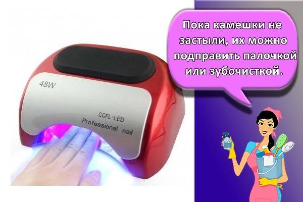 - Камешки закрепляются с помощью любого удобного инструмента. На них слегка надавливают, чтобы они утонули в лаке.