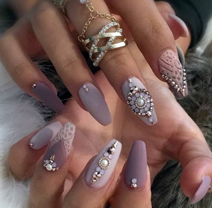 Этот роскошный маникюр в серо-коричневых тонах держится в топе популярности в течение двух последних сезонов. Несколько напоминает об Индии и ее роскошных красавицах. Стразы обогащают картину, их вид перекликается с двойным кольцом на цепочке. Надо отметить, что этот вид колец также является абсолютным хитом последнего времени.