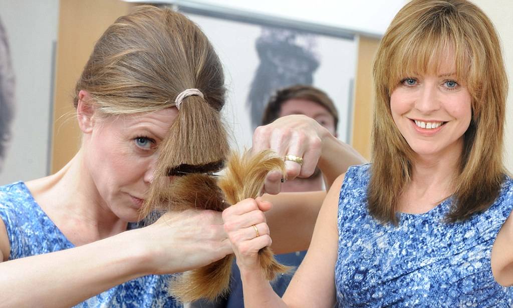 - Расчесать волосы к самой макушке и туго скрутить в жгут. Отрезать необходимую часть. Расчесать шевелюру.