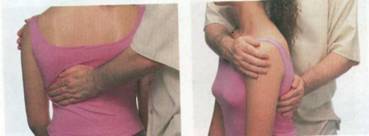 Плавно верните руку в исходное положение, и снова ваша рука на его плече. Массируйте ладонью трапециевидную мышцу в разных направлениях от верхнего угла лопатки до основания шеи. Разгибайте пальцы вперед.