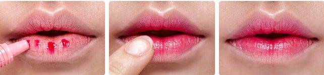 Подобный эффект достигается очень просто – необходимо точечно нанести помаду в хаотичном порядке, уделяя внимание контуру (выделяйте их белым карандашом). А затем просто растирающими движениями губ сгладить тон