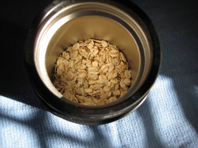 В него насыпают ½ ст. овсяных хлопьев и заливают их кипятком, пока вода не покроет хлопья. Утром кашу перекладывают в миску, добавляют кефир или обезжиренный йогурт, кунжут, фрукты или сухофрукты, тёмный шоколад, орехи.