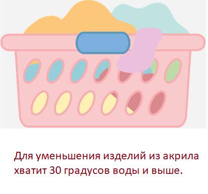 - Для уменьшения изделий из акрила хватит 30 градусов воды и выше. При этом следует быть крайне осторожными, чтобы не повредить вещь, используйте специальные мешочки для стирки. Режим отжима вещей сделайте максимально слабым.