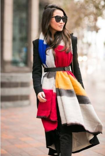 Этот самый объёмный из всех видов шарфов согреет в самую ненастную погоду. Его можно просто накинуть на плечи, а концы завязать ремнём или поясом. Пледы могут иметь разную цветовую палитру, интересно смотрятся изделия с принтами и орнаментами