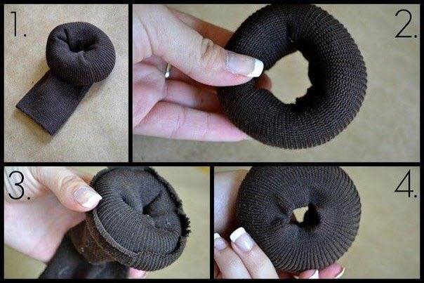 На случай, если вам не удастся отыскать в магазинах пончик, то его может заменить очень толстая резинка или носок. Для этого следует отрезать «пятку» и «мысочек», а затем закатать носок в виде «бублика».