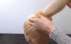 - Голову наклонить таким образом, чтобы волосы смогли равномерно распределиться по всей поверхности пончика. Зафиксировать их положение можно, воспользовавшись еще одной резинкой;
