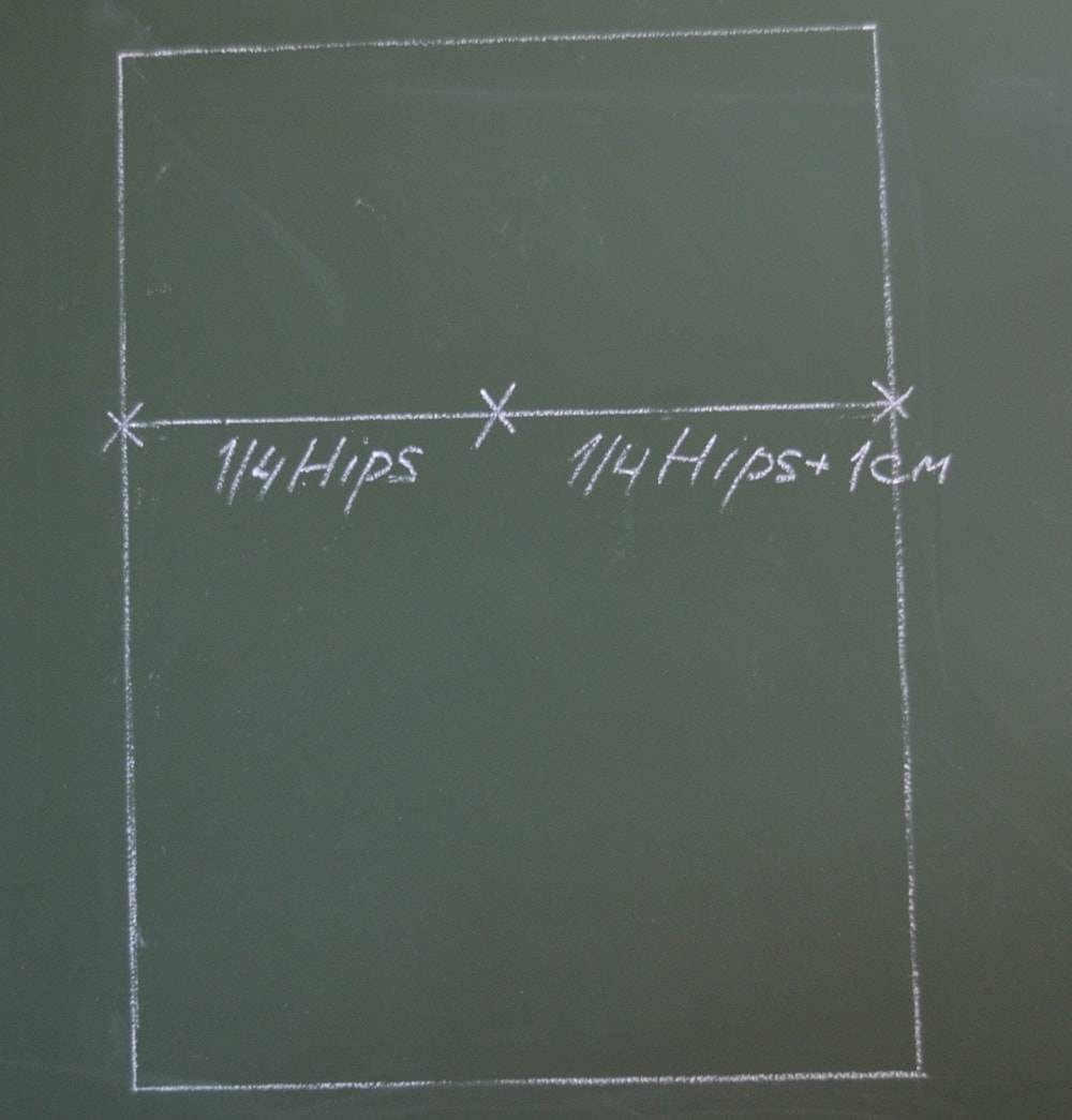 Вначале проведите горизонтальную линию для талии, затем отступите вниз 21-22 см (в зависимости от вашего роста) и проведите линию бедер.