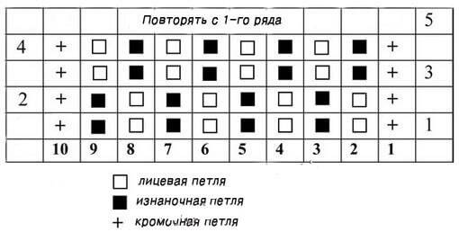 1-й р.: 1 кр., 1 лиц., 1 изн., 1 л., 1 изн., и т. д. 2-й и 4-й р.: как смотрит вязка. 3-й р.: 1 кр., 1 изн., 1 л., 1 изн., 1 л., и т. д.