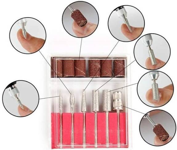 Цилиндрическая — придает нужную форму ногтю и корректирует его длину; игловидная — служит для бережного удаления кутикулы; конусная — необходима для обработки боковых валиков; «кукуруза» — используется при снятии гель-лака.