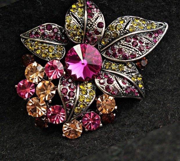 - Броши. Снова в моде броши в винтажном стиле, украшенные камнями и выполненные в технике «под старину». Также в тренде яркие фигурные брошки хэнд-мэйд, изготовленные из бисера и страз, нашитых на основу из натуральной кожи.