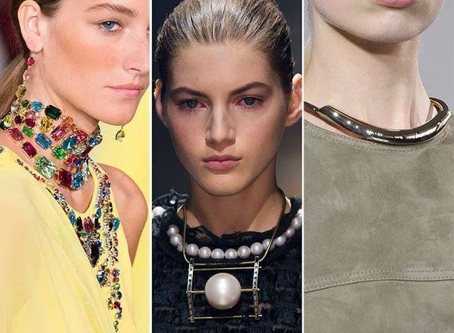В тренде металлические, текстильные, шёлковые ожерелья, дополненные стразами, камнями, бахромой и кристаллами. Они незаменимы в повседневных и деловых образах, а также являются вариантами для праздничных луков. В моде также оригинальные кожаные чокеры, которые можно носить с офисной одеждой.