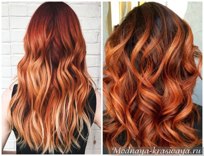 Рыжая копна волос сама по себе выглядит ярко и привлекательно, но почему бы еще более не увеличить ее визуально? На помощь придет мелирование в его калифорнийском варианте. Не возбраняется добавить в прическу более темные прядки наравне с осветленными, выбор их зависит от желания клиентки салона. Темно-ореховые, махагоновые, янтарные, медовые, апельсиновые оттенки – все это выглядит на рыжих волосах так же, как звучит – вкусно, сочно, восхитительно.