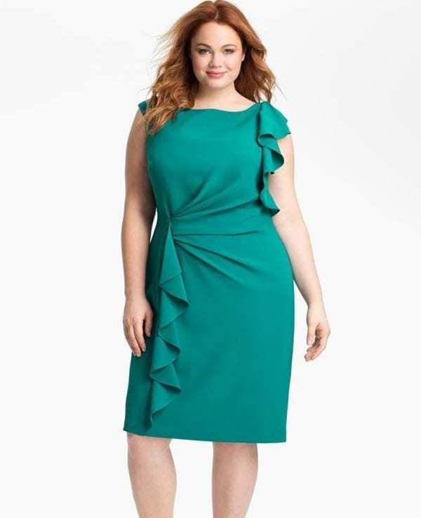 Платье футляр с воланами. Учтите, что рюши, воланы и оборки в особом тренде в наступившем сезоне. Поэтому используйте их в своих нарядах. Но помните одну особенность — воланы и рюши визуально увеличивают зону тела, в которой расположены. В данном случае вы можете подобрать модель платья миди с воланом по низу юбки или с воланом в линии декольте. В верхней части оборка всегда зрительно расширяет линию плечей и немного увеличивает форму бюста. Поэтому если у вас фигура «перевернутый треугольник», лучше выбирайте первый вариант наряда (модель с воланом по низу юбки).