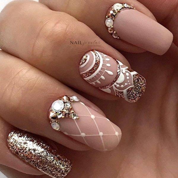 Стразы не могут пройти мимо ни одного нарядного дизайна ногтей, красиво придавая блеск любому виду маникюра. Вечерний маникюр с вензелями и кружевами, выполненными из матового кружева, можно дополнить парочкой лаконичных камушек для придания блеска. Также прекрасен кружевной маникюр с блестками в виде золотых вензелей, литья золотом и многими вариациями для создания шикарного кружевного маникюра с блестками и стразами в новых решениях.