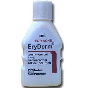 - Эридерм. Раствор для местного применения с эритромицином подавляет развитие пропионовых бактерий, а спирты, входящие в состав лекарства, дополнительно подсушивают и дезинфицируют кожу.