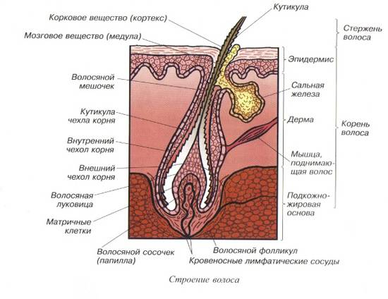 Рис. 2. На фото строение волосяного фолликула. Желтым цветом обозначена сальная железа.