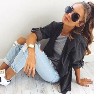 На фото представлен вариант на раннюю осень. Приталенные джинсы, свитер модного бежевого оттенка и черная сумка с солнцезащитными очками, которые создают грамотный акцент.