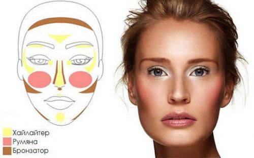 Для этого наносим бронзатор на зоны лица, которые мы хотим уменьшить или заметно сузить, а хайлатором выделяем область, которую хотим выделить. На щечки наносим натуральный оттенок румян. Все средства стоит тщательно растушевывать.